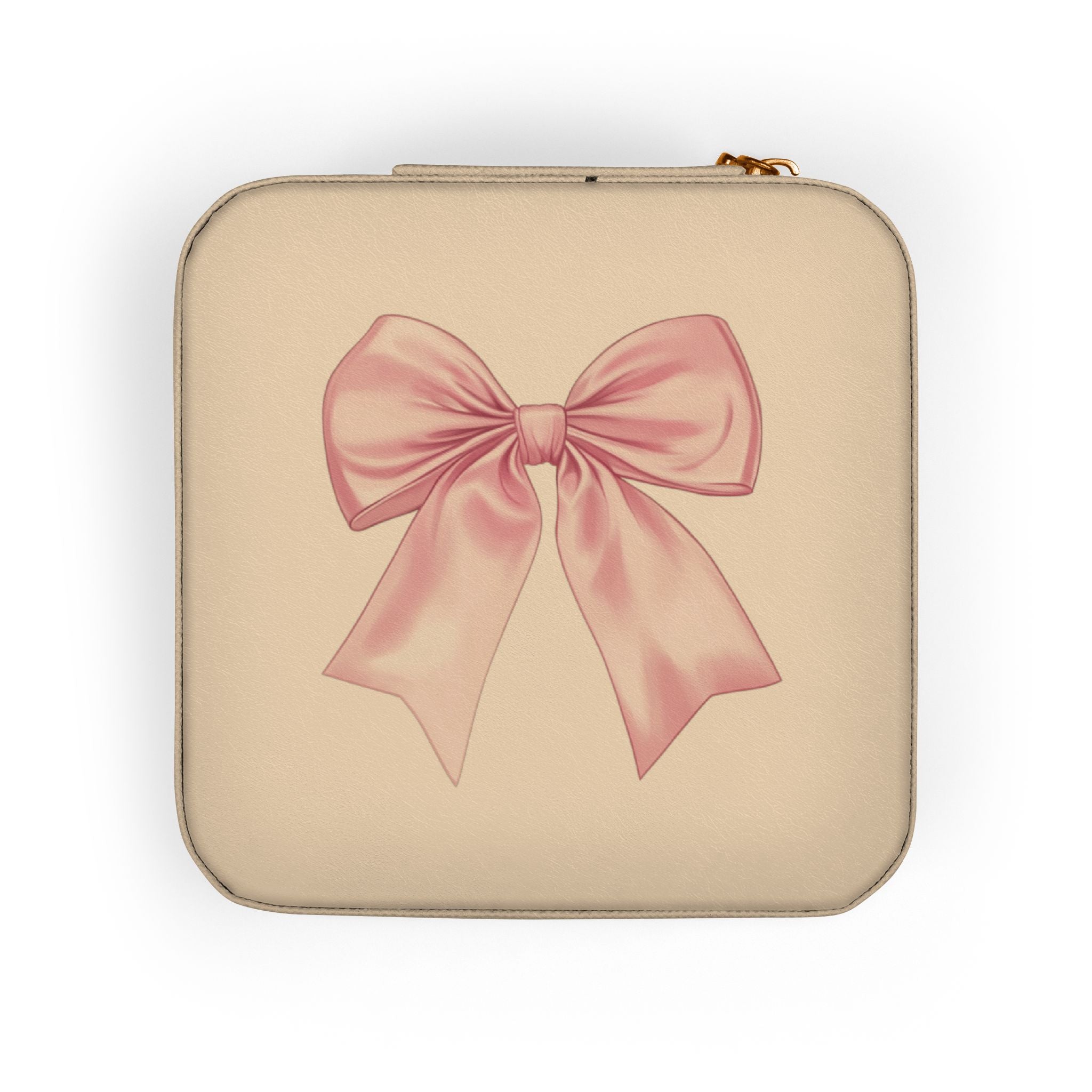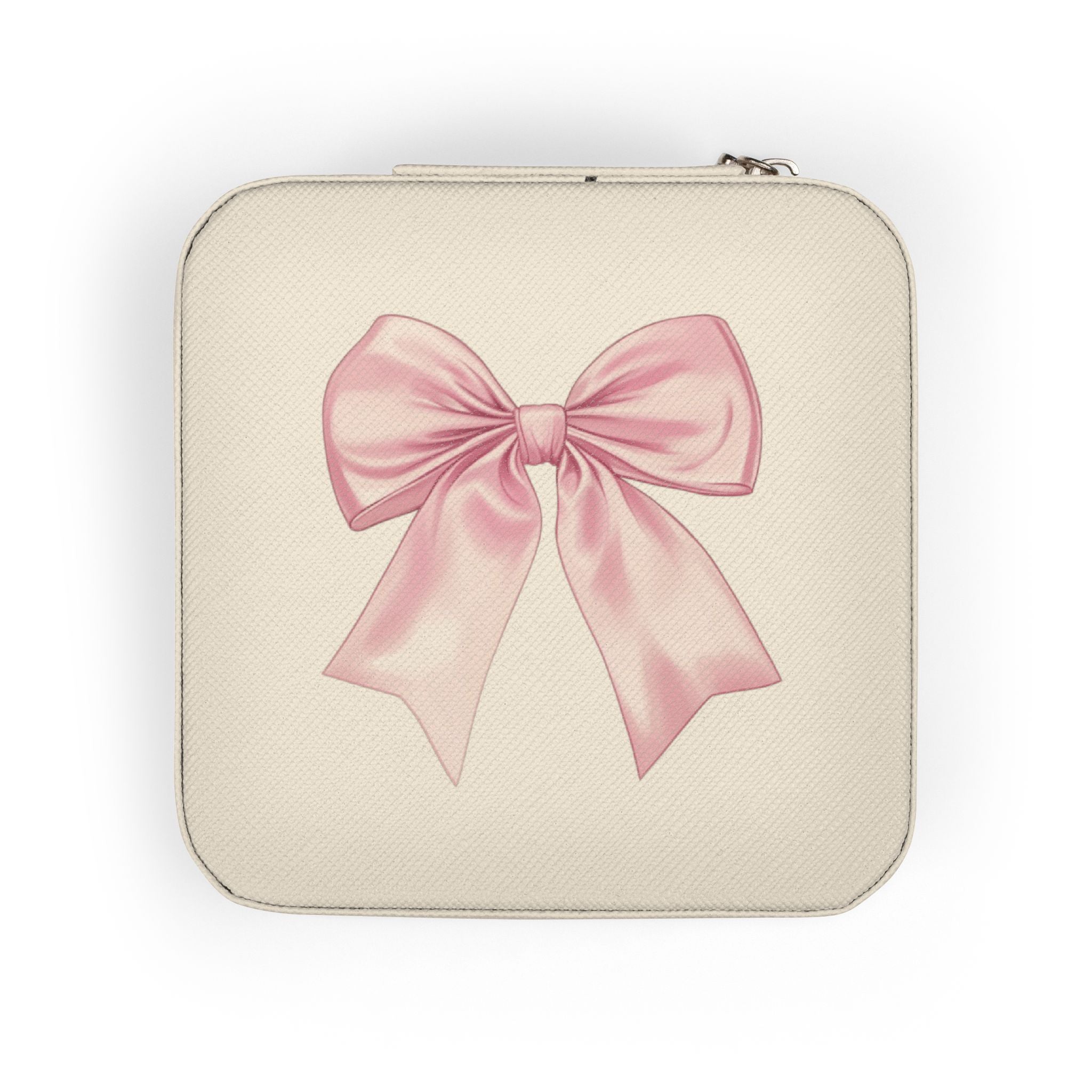 A Pink Bow compact jewelry travel case crafted for the person who carries sentimental pieces everywhere they go. The petite square fits into a purse or carry-on without crowding space, but opens to a thoughtfully arranged interior: divided compartments, ring rolls and necklace hooks keep chains untangled and rings ready to wear. The soft, plush lining cushions delicate metals and gems, while the PU leather exterior and zip-around closure protect contents during transit. The sweet vintage-inspired print on the lid adds a personal, cozy touch — a little reminder of home while on the move. Product features - Travel-size: compact 4" x 4" x 2" footprint fits easily in bags - Organized interior: 4 compartments, ring rolls and three necklace hooks - Protective plush lining: soft fabric reduces scratches - Secure zip-around closure: durable zipper keeps items contained - Durable exterior: PU leather with UV-printed decorative lid Care instructions - Clean by wiping with a soft, damp cloth.